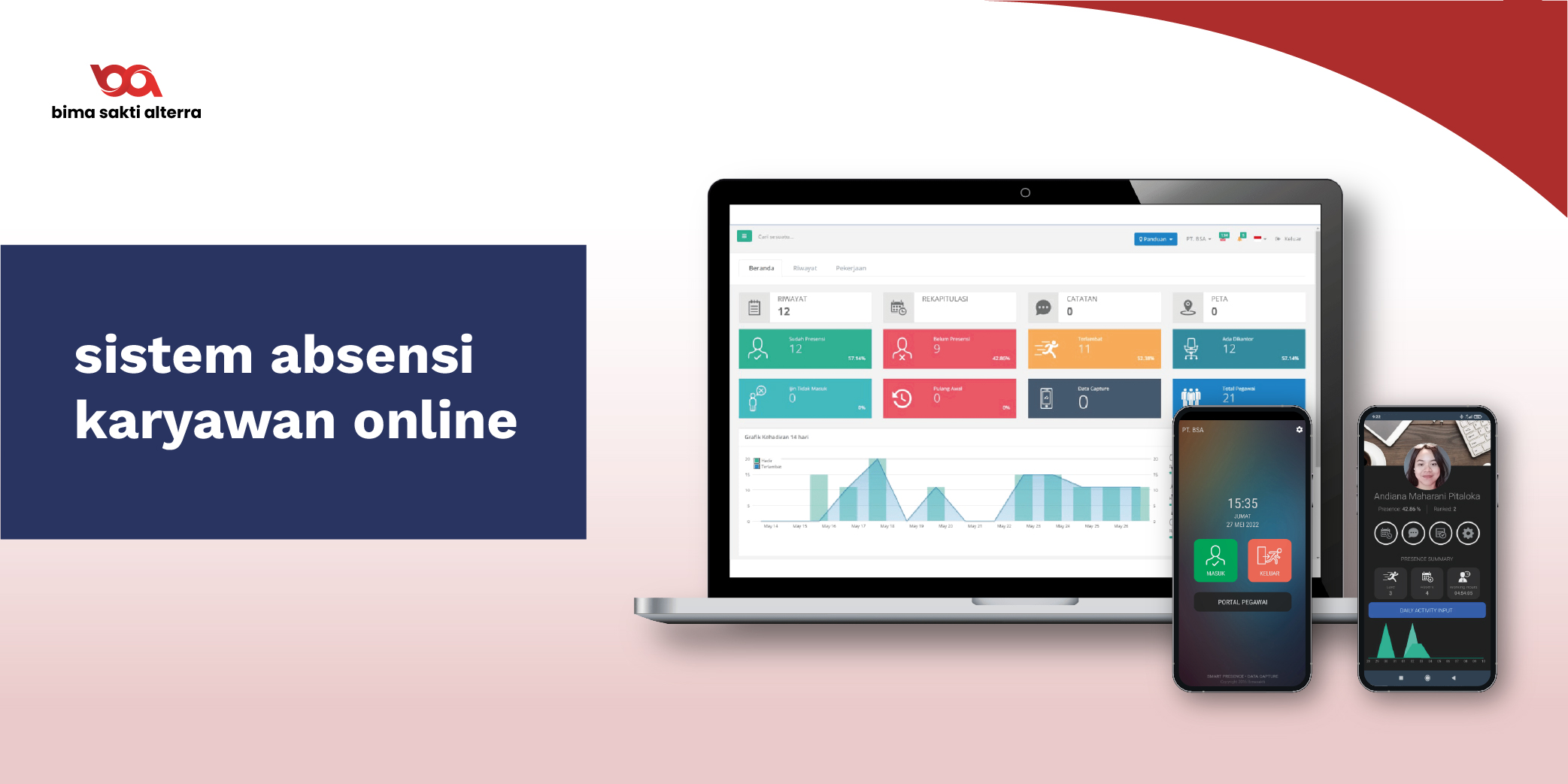 Absensi online adalah sistem yang memungkinkan perusahaan untuk merekam dan mengelola data kehadiran karyawan secara elektronik. Dengan menggunakan perangkat keras dan perangkat lunak yang canggih, solusi ini dapat mengotomatiskan proses absensi, mengurangi pekerjaan administratif yang berulang, dan meningkatkan efisiensi operasional perusahaan Anda.